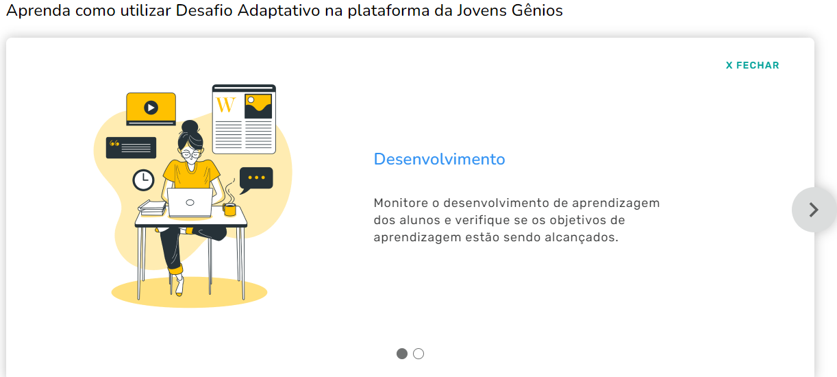 O desafio adaptativo acompanha o desenvolvimento de aprendizagem dos alunos e verifica se os objetivos de aprendizagem estão sendo alcançados. Avalie seus alunos durante o processo (avaliação formativa). O docente poderá reconhecer progressos, dificuldades e desenvolver estratégias para readequar o planejamento de aulas. Vamos criar um desafio juntos?