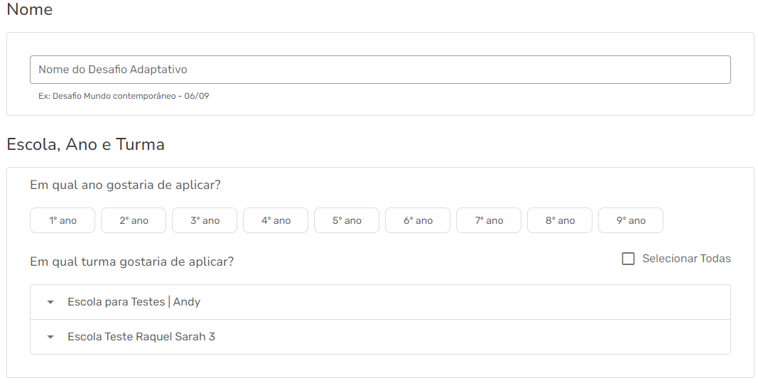Passo 4 - Dê um nome para o Desafio Adaptativo e escolha a escola, o ano e turma em que você deseja aplicar essa atividade.