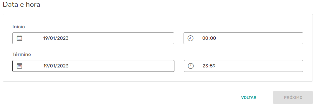 Passo 5 - Selecione a data e horário de início e fim do desafio e clique em “Próximo”.