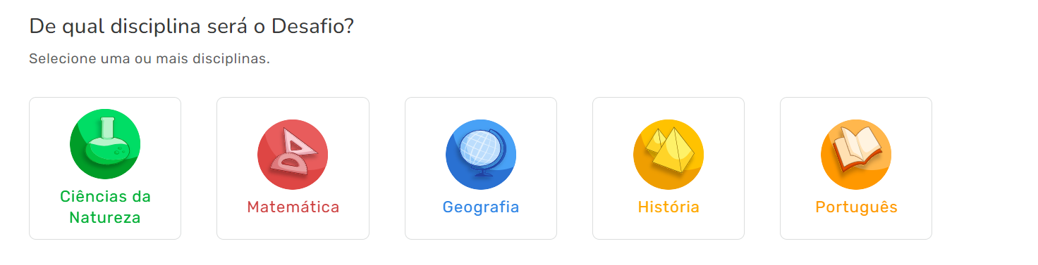 Passo 8 - Selecione as disciplinas que você deseja aplicar no Desafio e clique em “Próximo”. Lembrando que você pode selecionar uma ou mais disciplinas, beleza?