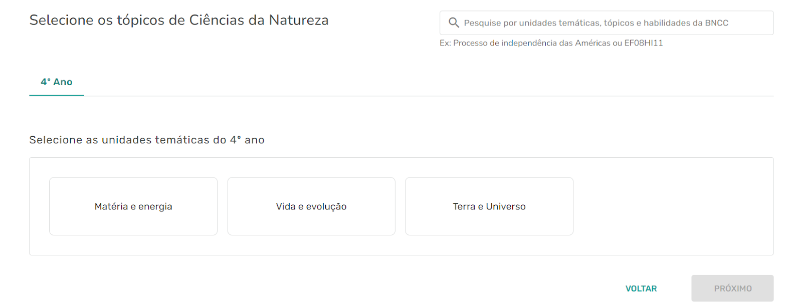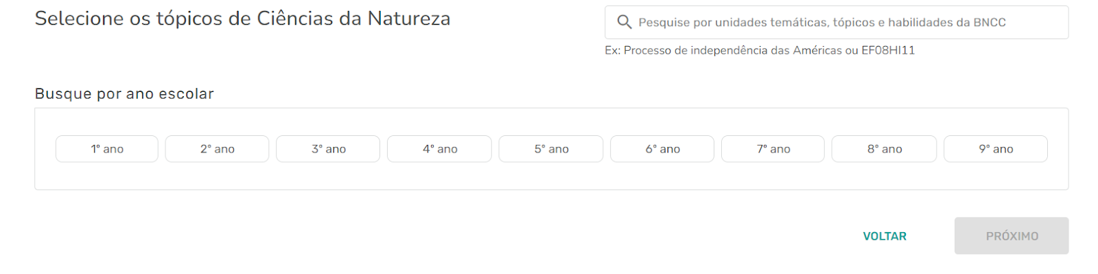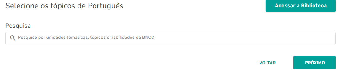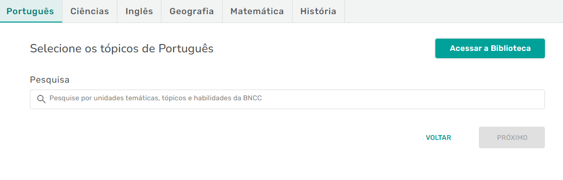 Passo 10 - Você pode clicar em “Acessar a Biblioteca” e selecionar os tópicos de acordo com o ano. Basta clicar no ano desejado e, depois, em “Próximo”. Assim, aparecerão as opções de conteúdo disponíveis do ano escolhido e aí você poderá adicionar o conteúdo que deseja, lembrando que você pode adicionar mais de um tópico, beleza?