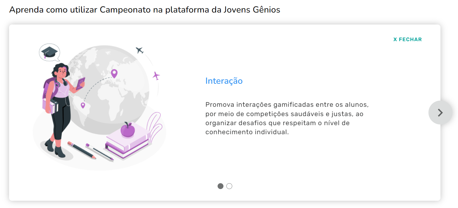 Quer criar uma atividade que crie uma disputa saudável dentro da plataforma? Nosso campeonato é uma competição onde os alunos da turma disputam entre si, similar ao formato de chaveamento em jogos de futebol. Que tal organizar um campeonato para ver quem dominou o conteúdo? Vamos nessa juntos?