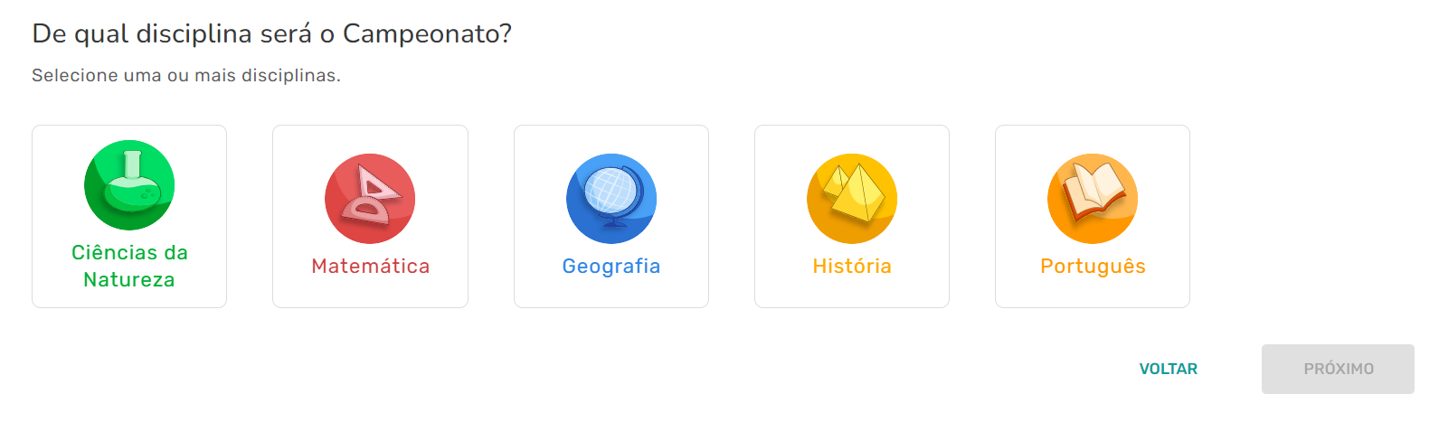 Passo 5 - Selecione as disciplinas que você deseja aplicar no Campeonato e clique em “Próximo”, Lembrando que você pode selecionar mais de uma beleza?