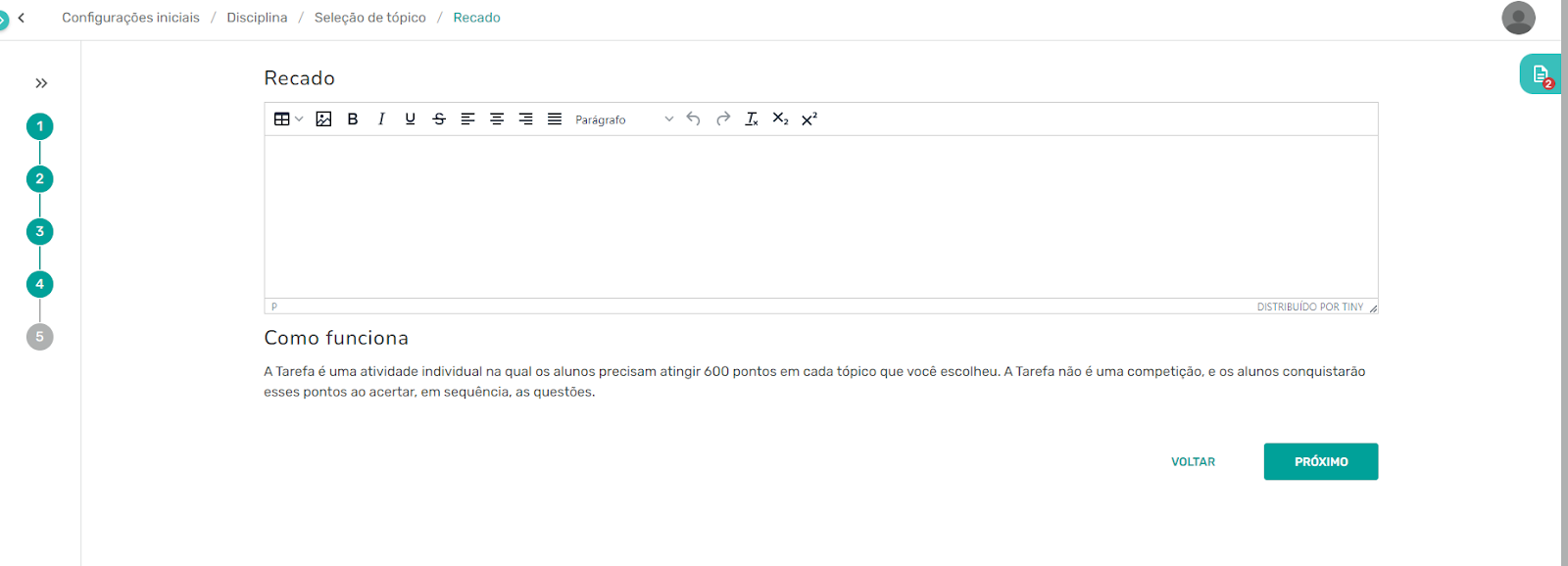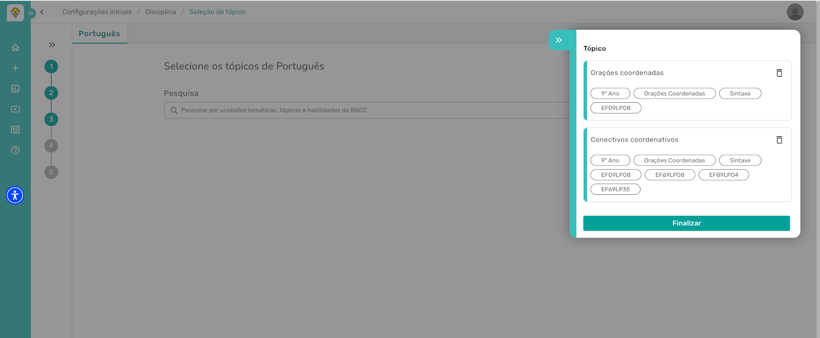 Passo 8 - Após isso, a tela de tópicos vai abrir com os mesmos tópicos que você selecionou na criação. Basta clicar em “Finalizar”