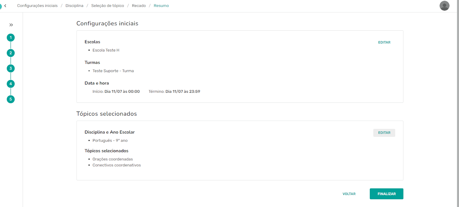 Passo 10 - Chegou a hora de revisar a atividade. Nessa página você consegue verificar todos os itens que você selecionou para confirmar se está tudo certinho. Estando tudo correto, você precisa clicar em “Finalizar”.