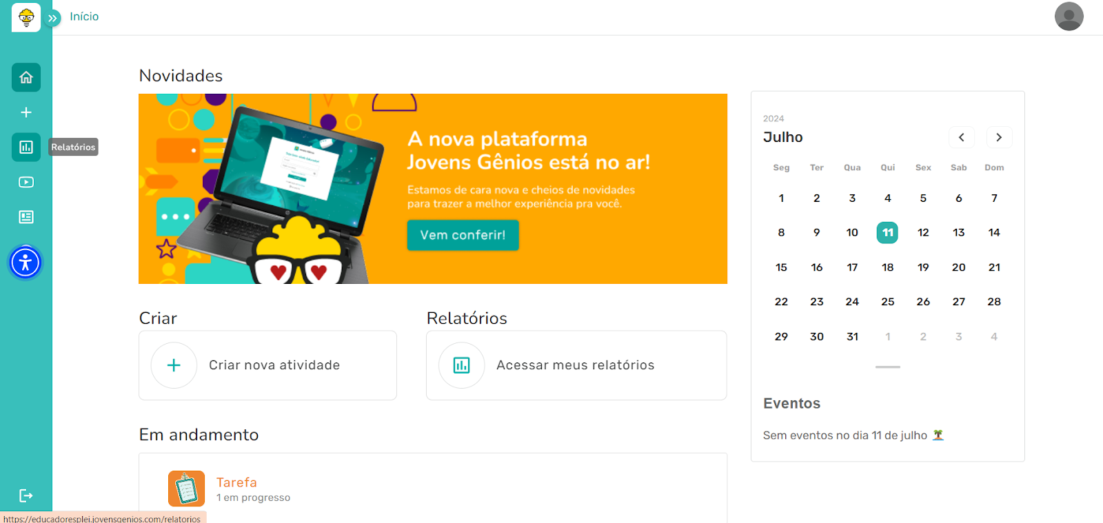 Passo 1 - Depois de acessar com e-mail e senha, você precisa clicar em “Relatórios”, que é representado pelo ícone de gráfico que fica logo abaixo do ícone de criação.