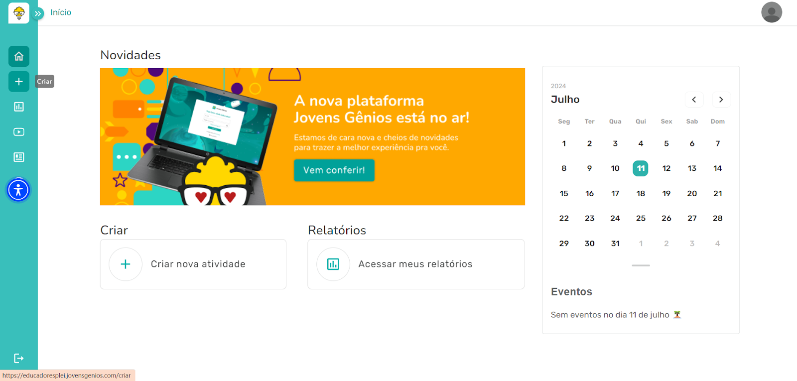 Passo 2 - Ao entrar na sua conta na Plataforma de Educadores, clique em “CRIAR”, que fica logo abaixo do símbolo da Home e localize a caixa “Prova Genial”.