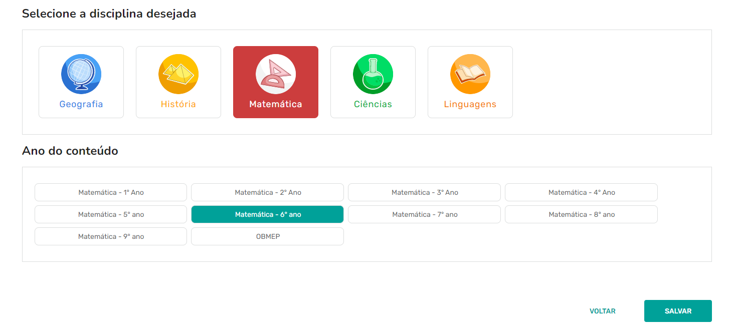 Passo 9 - Agora, você precisará escolher a disciplina relacionada às questões importadas e, logo após, o ano do conteúdo. Ao finalizar, clique em “Salvar”.