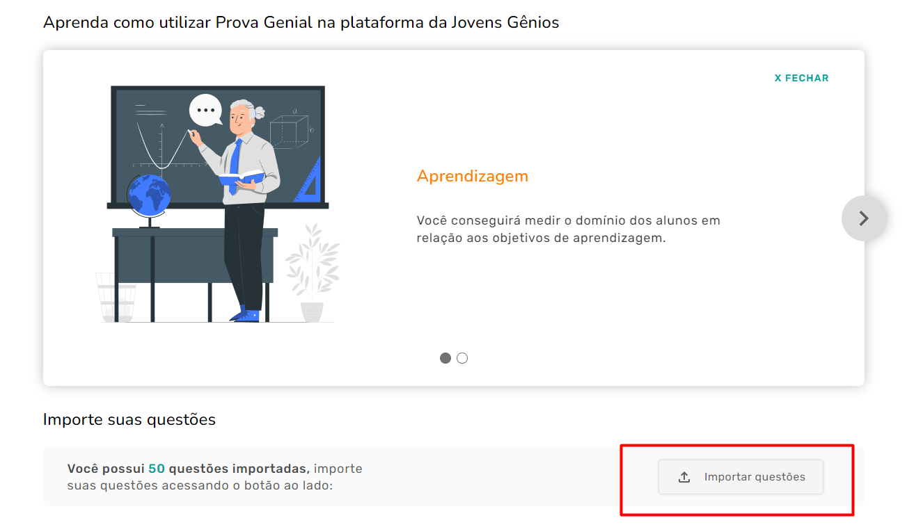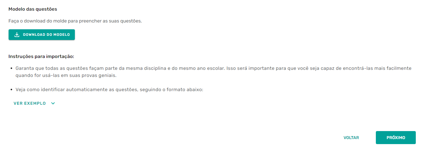 Passo 4 - Você verá algumas informações sobre a Prova Genial e, na mesma página você pode clicar no botão “Importar Questões”, que fica na parte debaixo da tela Caso você já tenha importado suas questões, basta clicar em “Próximo”.