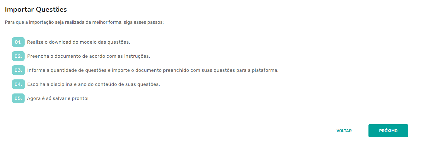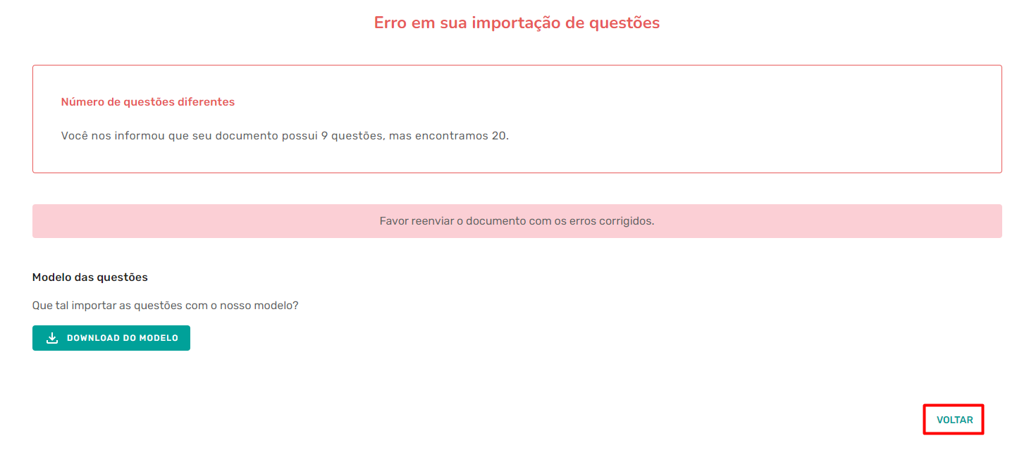 Passo 8 - Caso seja encontrado algum erro na importação de questões, clique em “voltar” para corrigir os erros identificados.