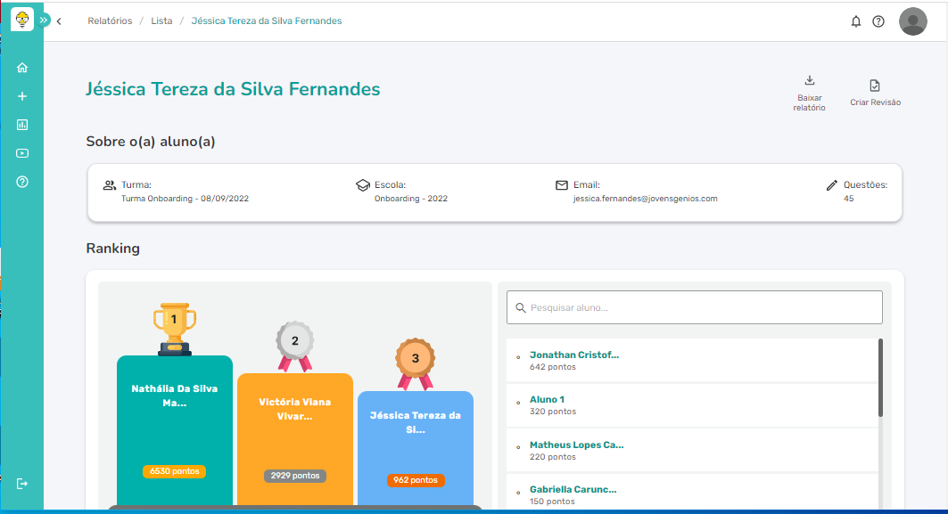 O botão “Criar Revisão” serve para que, depois da análise, o professor crie uma tarefa ou desafio adaptativo com intuito de melhorar o rendimento dele, em cima dos dados e com a ajuda da Inteligência Artificial.