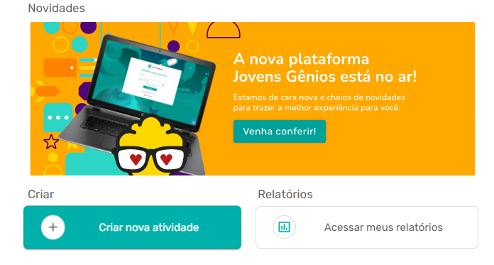 Passo 1: Ao entrar na sua conta na Plataforma de Educadores, selecione “Criar nova atividade” e escolha o “RAIO X”.