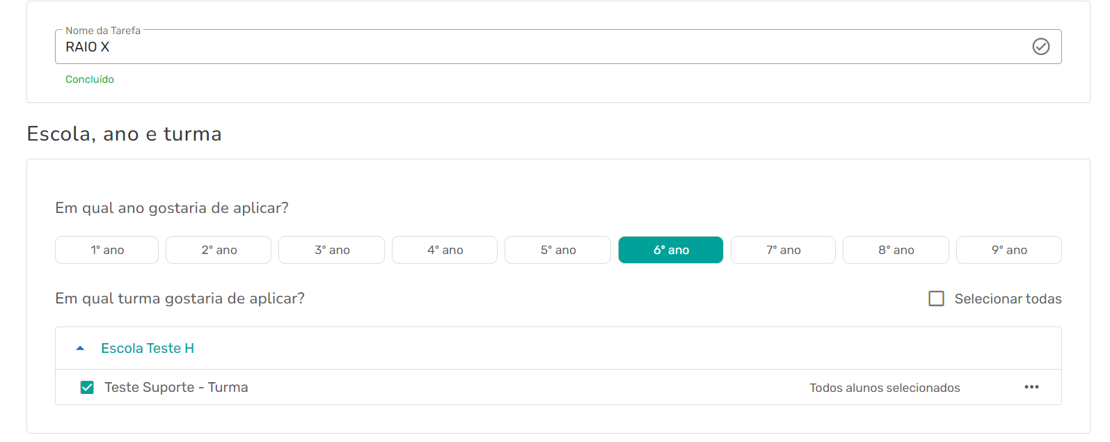 Passo 3 - Adicione o nome da tarefa, escolha a escola e a turma que você deseja passar a atividade. Nessa mesma página, você irá definir a duração da prova e o período em que essa atividade ficará disponível para o aluno, como o campo mostrado abaixo. Logo após, clique em “Próximo”, como na imagem abaixo: