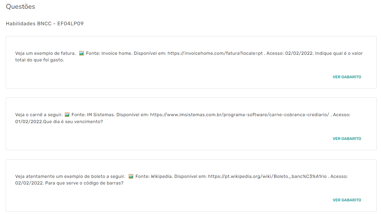Você também poderá ver exemplos de questões, clicando no botão à direita de cada habilidade:
