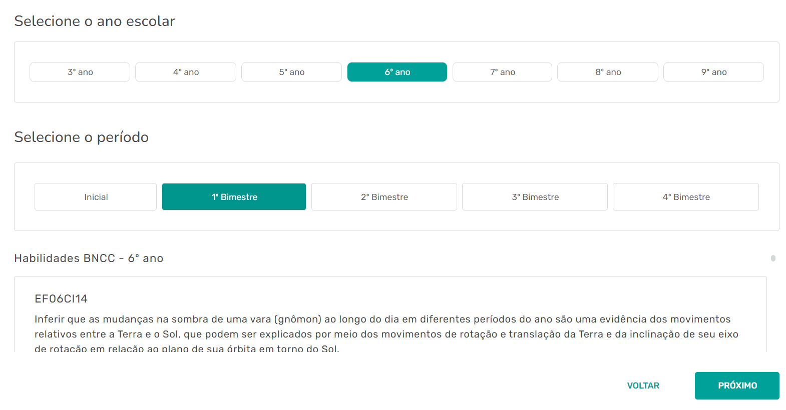 Passo 5 - Chegou a hora de escolher o ano escolar da atividade escolhida. Assim, a plataforma irá te mostrar temas e assuntos elencados pela BNCC para aquela disciplina e ano escolar de acordo com bimestre escolhido.