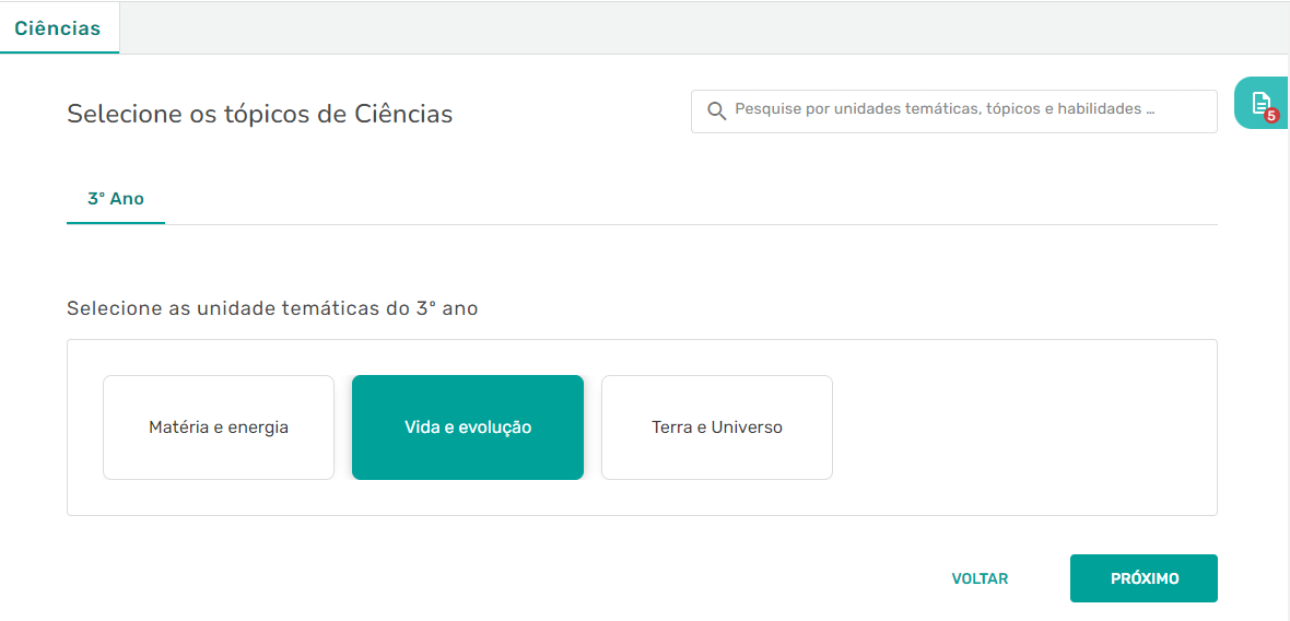 Passo 7 - Em seguida, selecione a temática que deseja trabalhar com seus alunos. Após selecionar, role para baixo e escolha os tópicos.