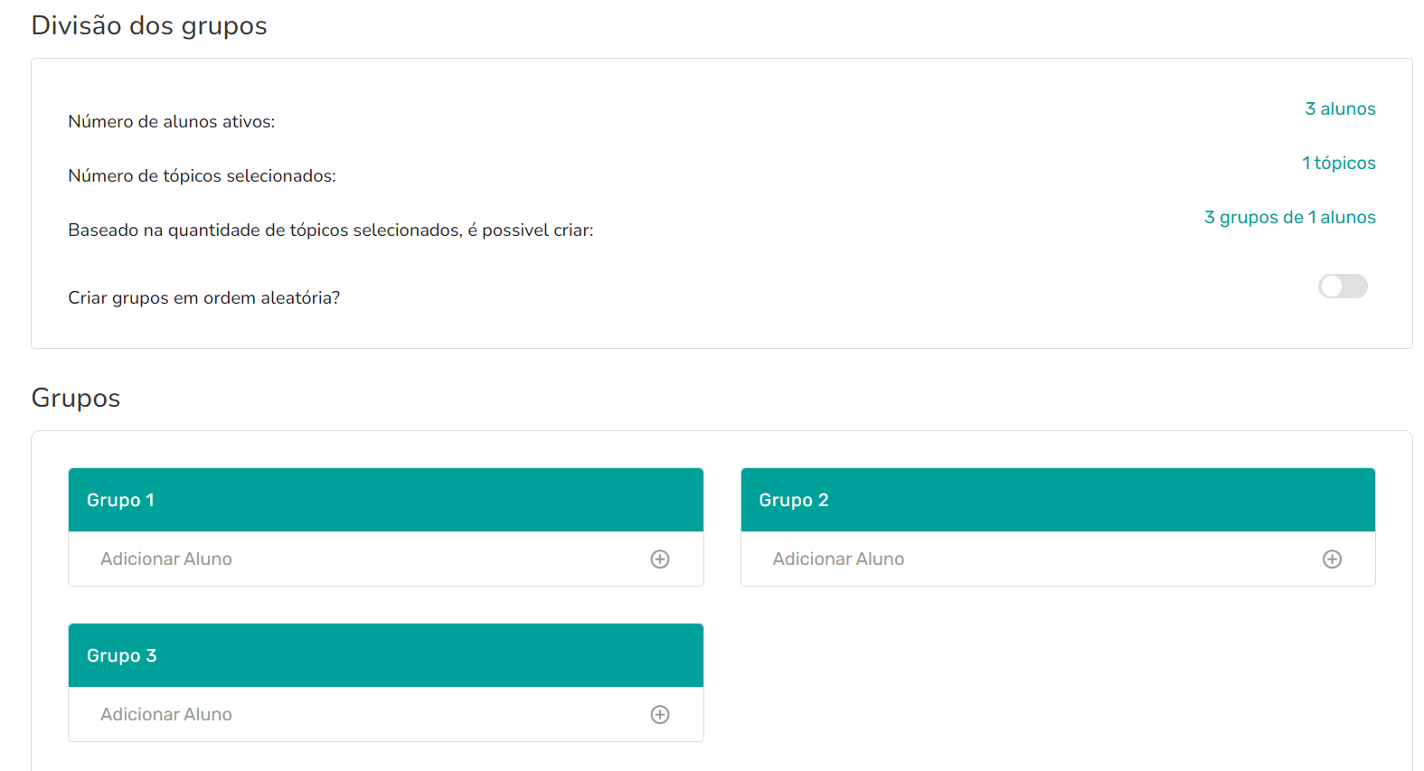 Passo 8 - Agora, é hora de criar os grupos. É possível escolher os alunos de cada grupo ou a ativar a opção “Criar grupos em ordem aleatória”.