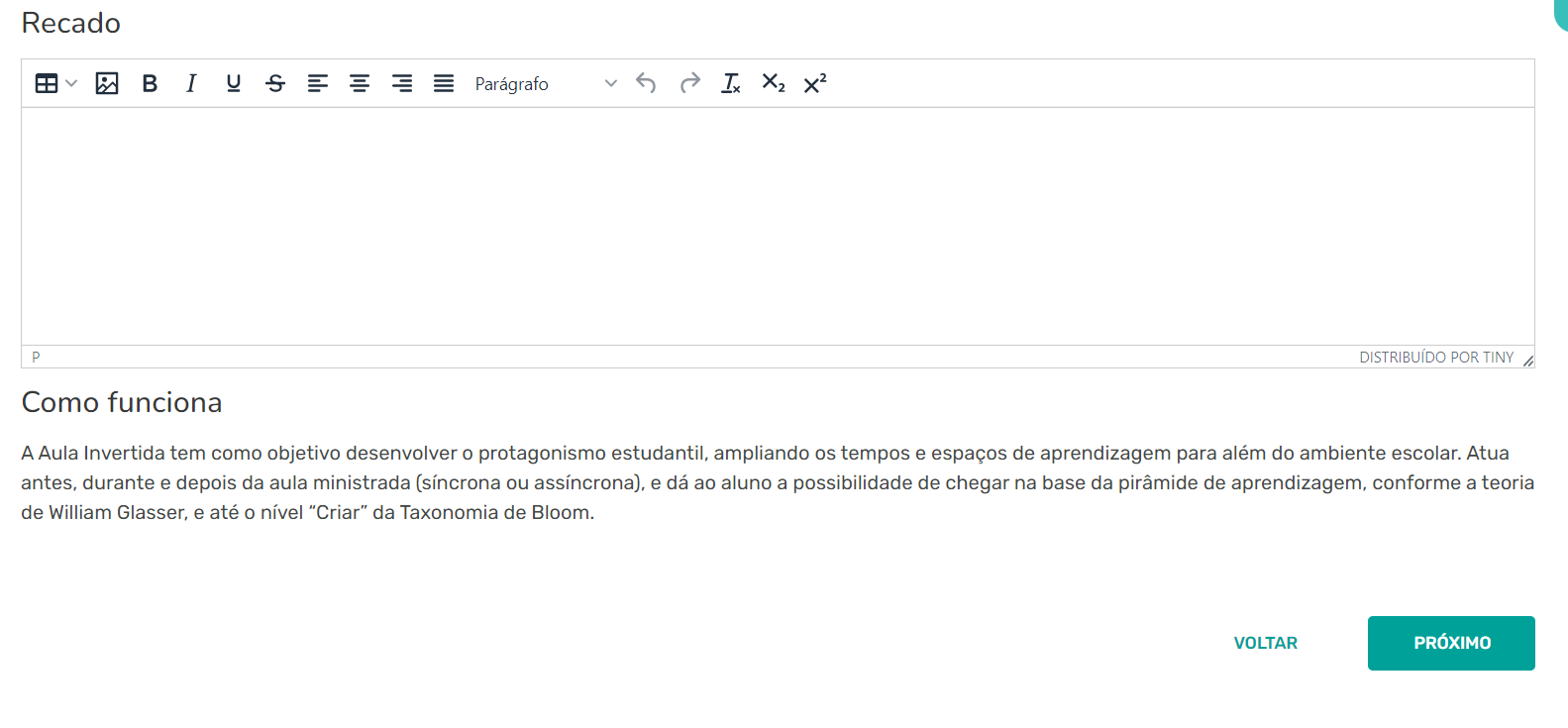 Passo 9 - Você terá um espaço para deixar um recado aos seus alunos, e uma breve descrição de como funciona a atividade selecionada.