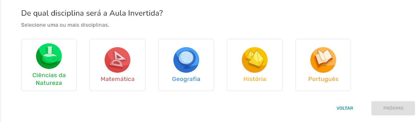 Passo 5 - Agora, escolha a(s) disciplina(s) que você deseja trabalhar com os seus alunos. Logo após, clique em “Próximo”.