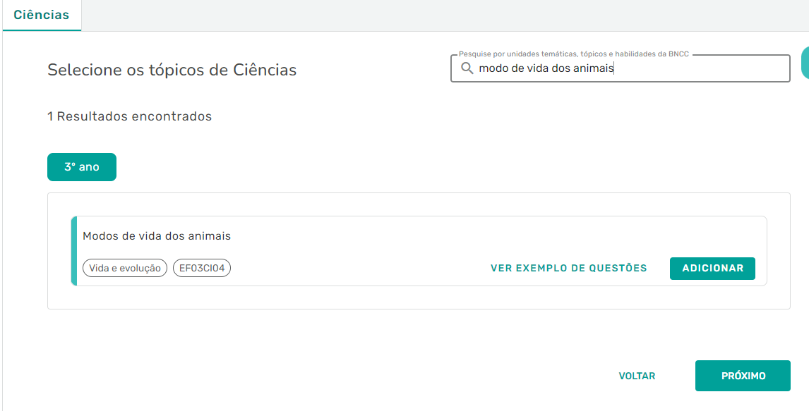Passo 6 - Agora, escolha o ano escolar e o assunto/habilidade da BNCC que você deseja trabalhar com seus alunos. Você possui duas opções: