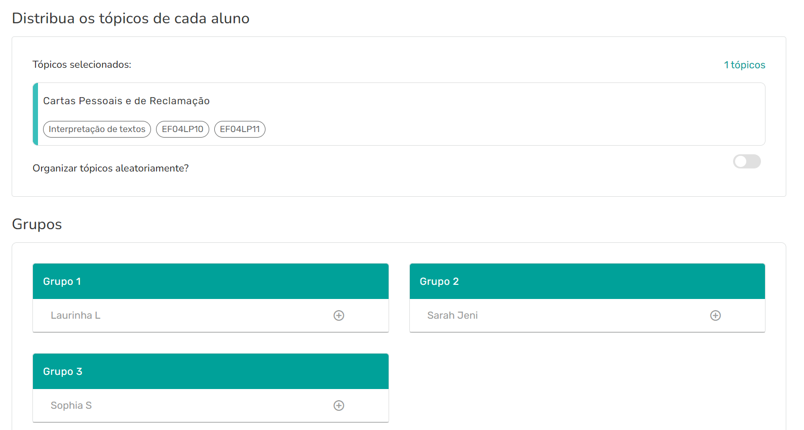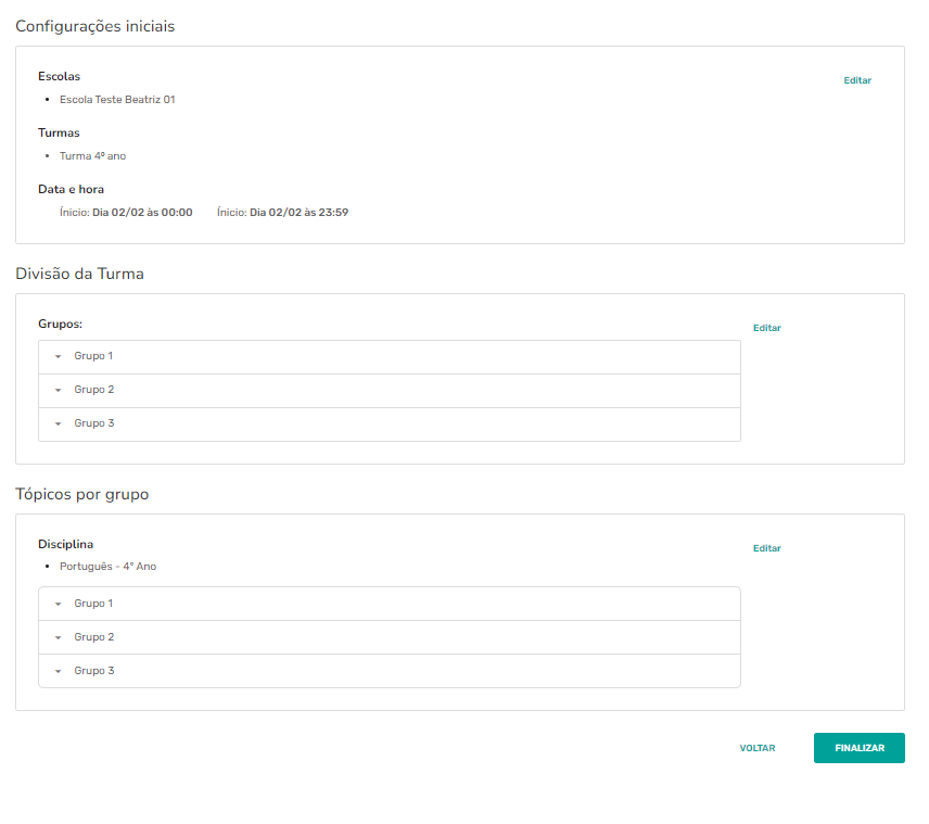 Passo 9 - Confira os tópicos escolhidos e os grupos criados antes de finalizar.