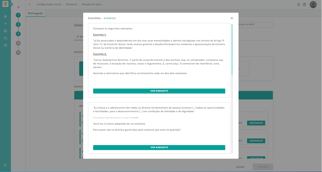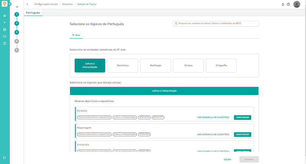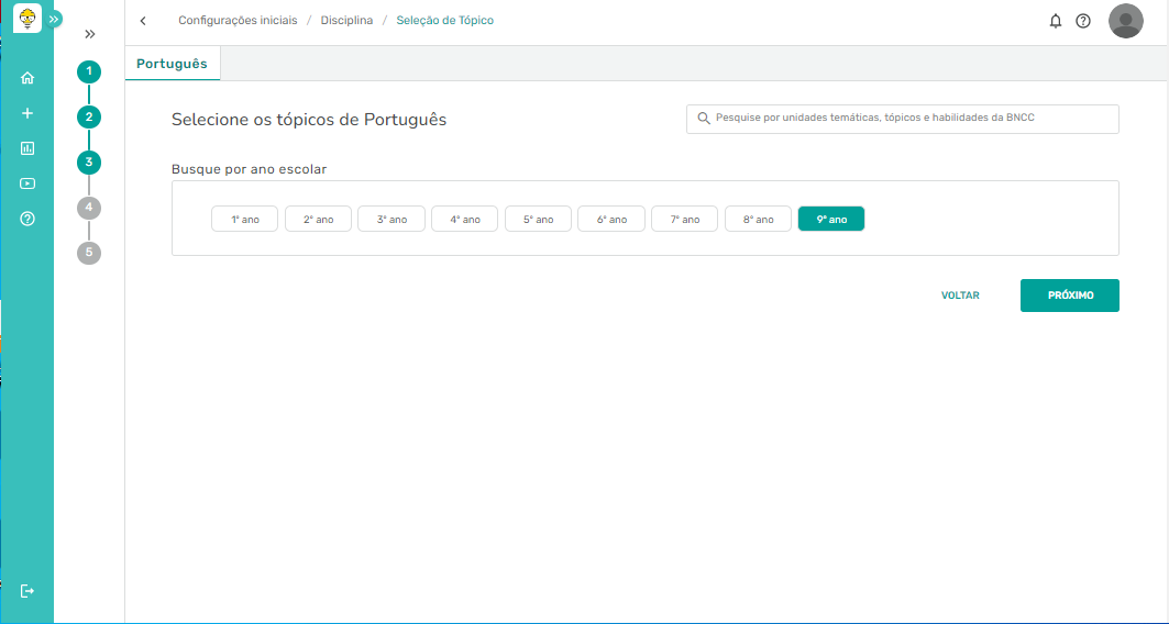 Passo 1 - No processo de criação da atividade ou avaliação, no terceiro passo do processo, é pedido para selecionar os tópicos da disciplina escolhida anteriormente. O exemplo que utilizaremos é a disciplina de Português com o 9° ano. Depois disso, iremos clicar em próximo.